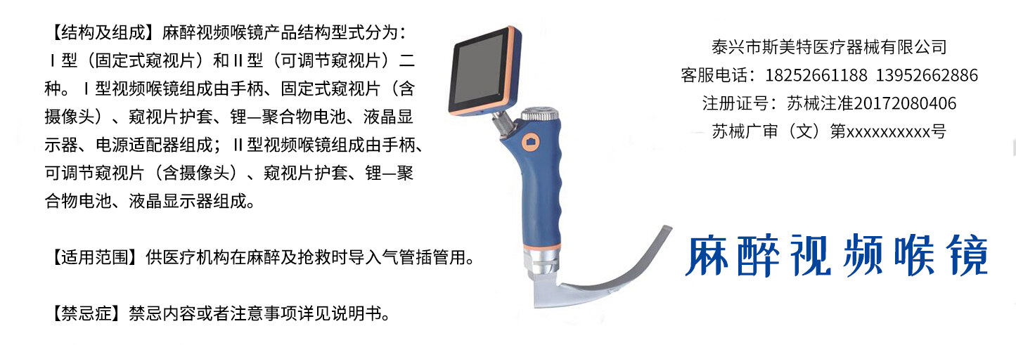 泰興市斯美特醫(yī)療器械有限公司是一家集麻醉視頻喉鏡研制、開發(fā)、銷售于一體的專業(yè)企業(yè)。近幾年來本公司通過不斷完善和改造,硬件設(shè)施與軟件管理達(dá)到標(biāo)準(zhǔn)。 本公司生產(chǎn)的麻醉咽喉鏡產(chǎn)品面向全國各省、市、自治區(qū),部分產(chǎn)品遠(yuǎn)銷美洲、歐洲、南非、東南亞等諸多國家及地區(qū)。置身中國經(jīng)濟(jì)開放的背景,制定了醫(yī)藥板塊的戰(zhàn)略決策和醫(yī)療器械行業(yè)的發(fā)展趨勢,制定了面向未來,與時俱進(jìn)的中長期發(fā)展規(guī)劃,確定了"以技術(shù)優(yōu)勢確立核心能力、